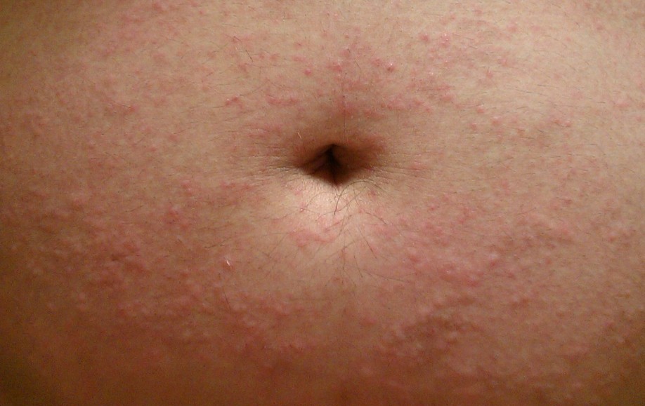 2、皮炎:多发生在颈后部或其两侧、肘窝、国窝、前臂、大腿、小腿及腰骶部等。常成片出现,呈三角形或多角形的平顶丘疹,皮肤增厚,皮脊突起,皮沟加深,形似苔藓。常呈淡红或淡褐色。剧烈搔痒是其主要的症状。