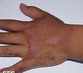 六、接触性皮炎(如下图):是指人体接触某种物质后,在皮肤或粘膜上因过敏或强烈刺激而发生的一种炎症。多数急性发作,如反复接触,可演变成慢性。中医学根据接触物的不同,而分别命名,如“马桶癣”、“漆疮”、“膏药风”、“粉花疮”等。其发生原因可分为原发性刺激和变态反应两种。临床表现为红斑、水疱、大疱甚至坏死等。病程有自限性。