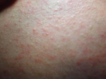 (二)亚急性湿疹 常因急性期损害处理不当迁延而来,皮损以红色丘疹、斑丘疹、鳞屑或结痂为主,兼有少数丘疱疹或水疱及糜烂渗液。