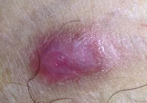 (2)病损的中心渐渐自动愈合,向周围发展,红斑的边缘炎症比较明显,上面可有皮疹、水疱、痂皮,甚至糜烂,形成环形。