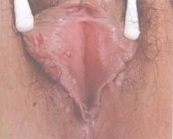 感染后平均约4~5日,外阴患部先有灼热感,随即发生成群丘疹,可为一簇或多簇,继之形成水疱。数日后演变为脓疱,破溃后形成糜烂或浅溃疡,自觉疼痛,最后结痂自愈,病程约2~3周。皮损多发于女性则多见于大小阴唇、阴蒂、阴阜、子宫颈等处,亦见于尿道口。原发性生殖器疱疹,往往伴有全身不适,低热、头痛等全身症状,局部淋巴结肿大。该病常复发,复发性生殖器疱疹较原发者轻,损害小,往往无全身症状。男性同性恋可出现肛门直肠HSV-2感染,其发病率仅次于淋球菌所致的肛门直肠炎,临床表现为肛门直肠疼痛、便秘、分泌物增加和里急后重,肛周可有疱疹性溃疡,乙状结肠镜检常见直肠下段粘膜充血、出血和小溃疡。