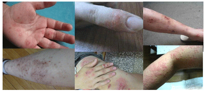 对患者造成外观损害:患处有成片红斑,密集或疏散小丘疹,或是肉眼难见的水疱,严重时有大片渗液及糜烂;在皮纹尤其运动程度较大的部位容易发生裂口,长期摩擦搔抓能引起显著的苔藓样化,和神经性皮炎慢性单纯苔藓不易区别。