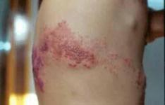 疱疹好发于春秋季节。发疹前往往有发热、倦怠、食不振等前驱症状,经1-3天后,患处皮肤潮红,进而露出大量成群簇集的粟至绿豆大的丘疱疹,快捷变为水疱,疱壁兴发奋亮,内容透明澄清,互不合成。皮疹沿皮神经分离,单侧发疹,不超过体表正中线,多呈不守则带状排列。习见于肋间神经、颈部神经、三叉神经及腰骶神经支配区,如颜面、颈、胸背、腰腹部,亦可进犯眼、耳、口腔及阴部粘膜、神经痛为本病特点之一,可于发疹前或陪同发疹露出。疼痛沿受累神经去配地区射出。老年患者常于危害消退后遗留较长时间的神经痛。病程约需1-2周,愈后可后遗暂且性色素沉着,不留疤痕,亦可因水疱破溃破形成糜烂或继发腐朽。