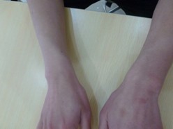 表现症状:手臂有大片皮疹出现,瘙痒剧烈,用手抓挠后易破,伴有渗液流出,之后有较强疼痛感。