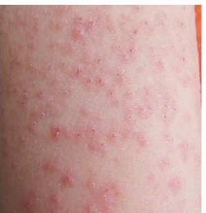 丘疹性荨麻疹是一种好发于婴儿及儿童的瘙痒性皮肤病。皮损常为圆形或梭形之风疹块样损害,顶端可有针头到豆大之水疱,散在或成簇分布。好发于四肢伸侧,躯干及臀部。一般经过数天到1周余皮损可自行消退,留暂时性色素沉着斑。皮损常亦可陆续分批出现,持续一段时间。本病瘙痒剧烈,可因反复搔抓而引起脓皮病等。