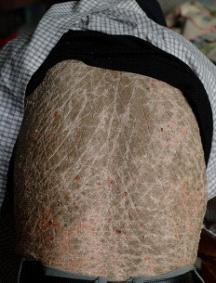 症状三:性联型鱼鳞病,性连锁隐患性鱼鳞病,一般多发生于生后、婴儿身上,这种鱼鳞病皮损鳞屑大而显著,呈黄褐色或污黑色大片鱼鳞状,皮肤干燥粗糙,往往遍布全身,腋窝、及肘窝等部位都会出现症状,而其中一腹部、背部最为严重。