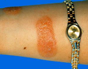 一、水疱破裂形成糜烂面,甚至组织坏死。接触物若是气体、粉尘、病变多发生在身体暴露部位,如手背、面部、颈部等,皮炎境界不清。有时由于搔抓将接触物带至全身其他部位,如外阴、腰部等,也可发生类似的皮炎。