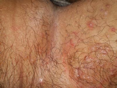 (2)渗液和糜烂面 由于瘙痒引起搔抓,将丘疹、丘疱疹、水疱等皮损抓破,不断有浆液渗出,常浸湿内裤,形成糜烂面。