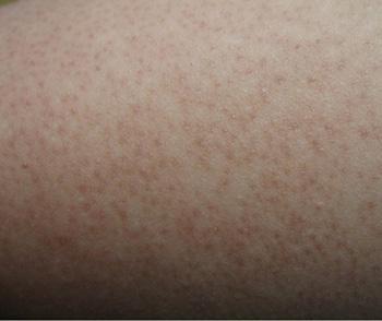 (1)这是一种遗传性皮肤病,它是由于毛囊口角化,影响了毳毛的生长,所以皮肤表面摸起来不光滑,象鸡皮疙瘩,的确在每个小丘疹中都有一卷曲的汗毛。这种疾病目前还没有根治的方法,但适当应用一些药物可以改善病情。