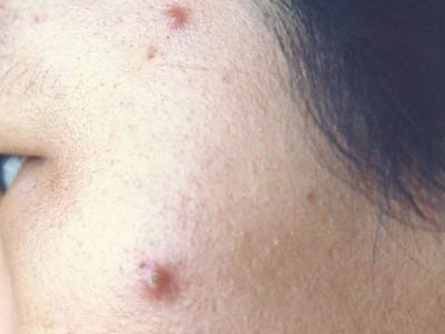 2、发病初期,毛囊口有栗粒大小的丘疹,丘疹为红色,贯穿毛发,后期转变为脓疱,脓疱溃破感染,导致脓液或脓血渗出,处理不当,病情加重。