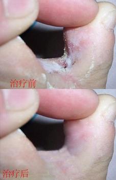 根据其病情给其制定了一个治疗方案,采用“中药离子渗透分型癣化疗法”,利用先进的皮癣病 wood伍德诊断仪及配合 内服我院研制的中药配方,治疗半个疗程(12天)就见到了明显的效果,瘙痒感明显减轻,晚上能好好的睡一个安稳觉了,原先扩散的暗红小点开始退化,片状鳞 屑开始脱落,脚底发硬皮肤开始变软,看到这样的结果患者非常高兴,对康复非常有信心。