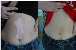 康复情况:袁教授根据潘小姐身体病情,以PRD补骨脂修复术综合治疗。一周后白斑几乎停止增扩,颜色明显改变,治疗2个月,白斑中央出现散在性色素岛,3个月后患处黑色素开始融合,皮肤显出正常色,这次治疗成功让潘小姐痊愈了。