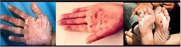 由致病性丝状真菌感染引起,足癣较手癣更为常见。临床可分为角化型、水疱型、丘疹鳞型、间擦型和体癣型等数种,也可混合出现。本病有传染倾向,其发生与密切接触患者的手足部位和用品,如拖鞋、浴盆、拭脚布等有很大关系。手癣又常由患者自身足癣传染而来。