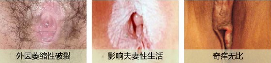 外阴大阴唇扁平,小阴唇消失,阴蒂萎缩变小或粘连。尿道口萎缩,严重时小便失禁,阴道口萎缩,性生活困难。部分患者波及肛门白斑及萎缩,引起肛周皮肤无皱褶,弹性降低,引起大便时肛裂。约50%患者外阴皮肤出现大面积色素减退。