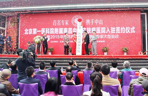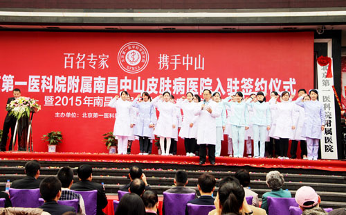 2015年3月18日上午,北京第一医科院附属南昌中山皮肤病医院入驻签约仪式暨2015年南昌首届皮肤病疑难病专家大型会诊活动在南昌中山皮肤病医院举行。中国医科大学航空总医院皮肤激光整形科主任刘永生博士、原复旦大学附属中山医院青浦分院俞婉芳主任、原上海胸科医院医务科长马继鸿女士以及多位专家学者和企业代表共二百余人出席, 国家重点医学科研机构、北京第一医科院附属医院在南昌中山皮肤病医院落户,是江西省第一家经省、市卫计委批准设置的三级皮肤病专科医院,此举标志着我国华东地区皮肤病领域的诊疗技术、专家设备、医学科研等方面又上了一个更高的台阶,为治疗提供了更强有力的保障,对整个华东地区的皮肤病诊疗事业的发展将起到巨大的推动作用。