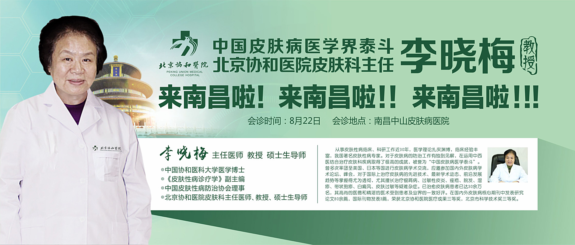因为接诊时间有限,此次南昌中山皮肤病医院特邀北京协和医院皮肤科主任李晓梅教授到院亲诊,在此期间为了让江西南昌市民足不出市,到南昌中山皮肤病医院即可享受北京名家亲诊。此次北京皮肤名家到南昌,广大江西患者可通过网络预约,享免排队、免专家挂号费、免专家诊费。